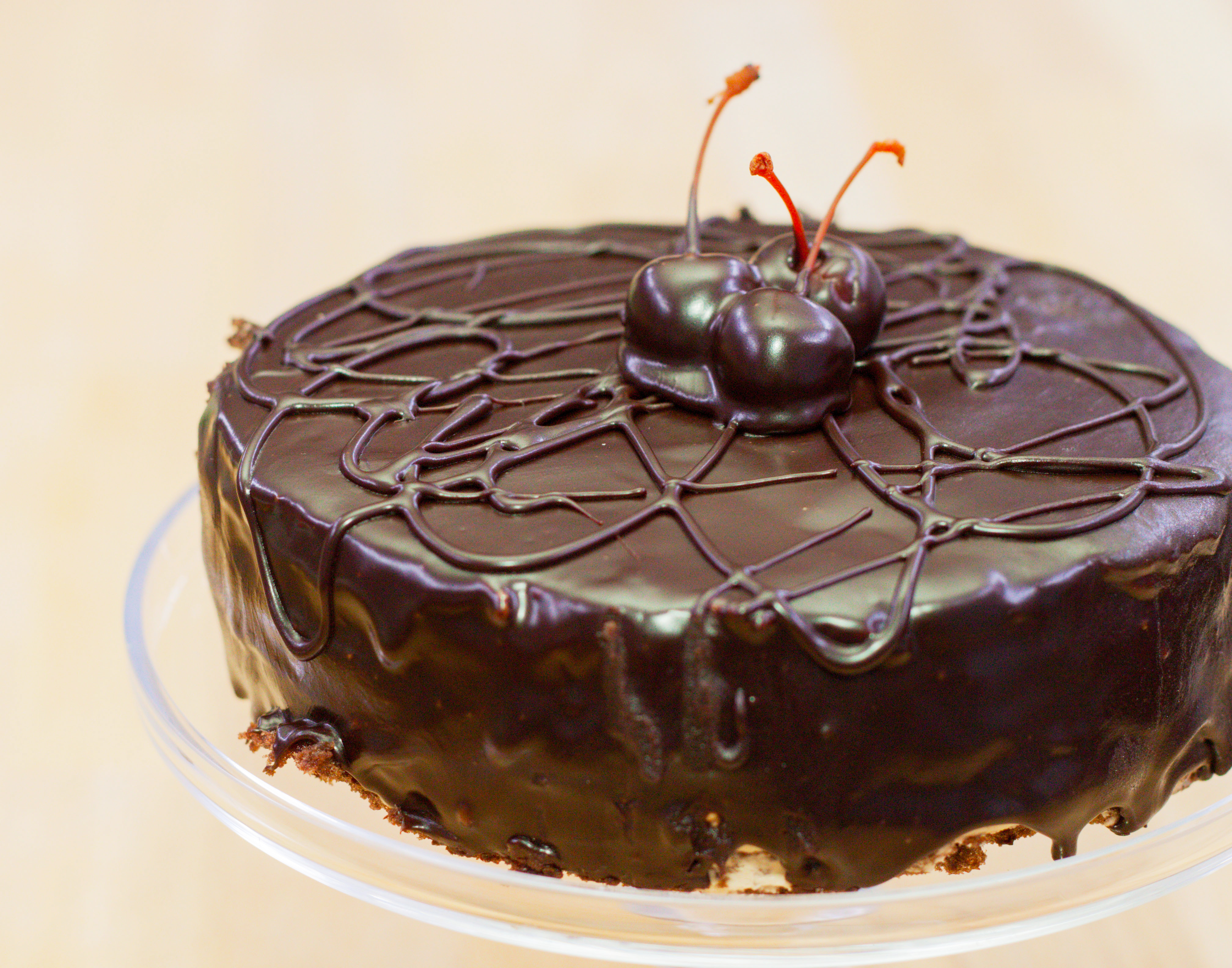 Мука пшеничная хлебопекарная в/с, яйцо куриное, сахар, масло сливочное, молоко сгущенное с сахаром, вишня замороженная, глазурь шоколадная, какао-крем, крахмал кукурузный, рябина на коньяке, корица, ванилин