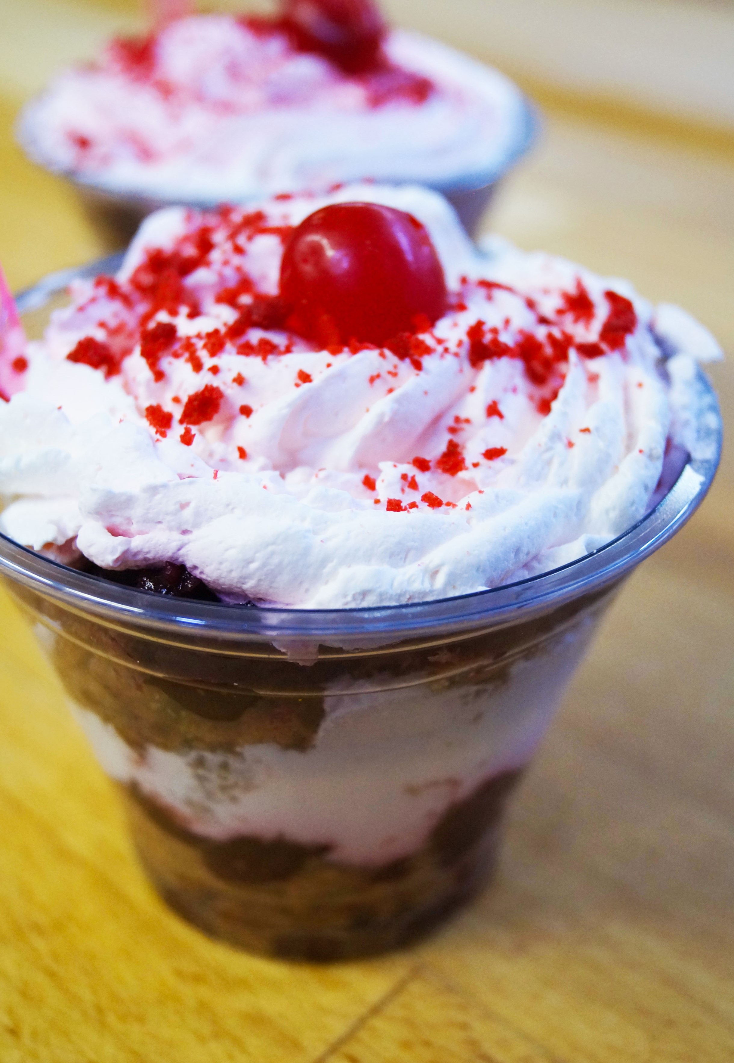Бисквит белый, сироп с рябиной на коньяке, вишня, сахар, взбитые сливки, джем, шоколад