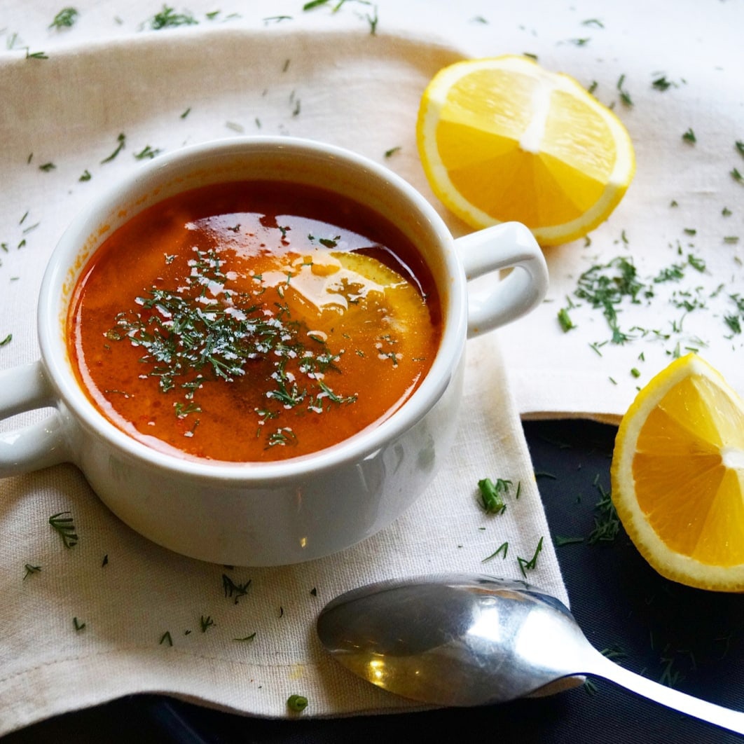 бульон говяжий, ребро варено-копченое, колбаса полукопченая, маслины, огурцы маринованные
