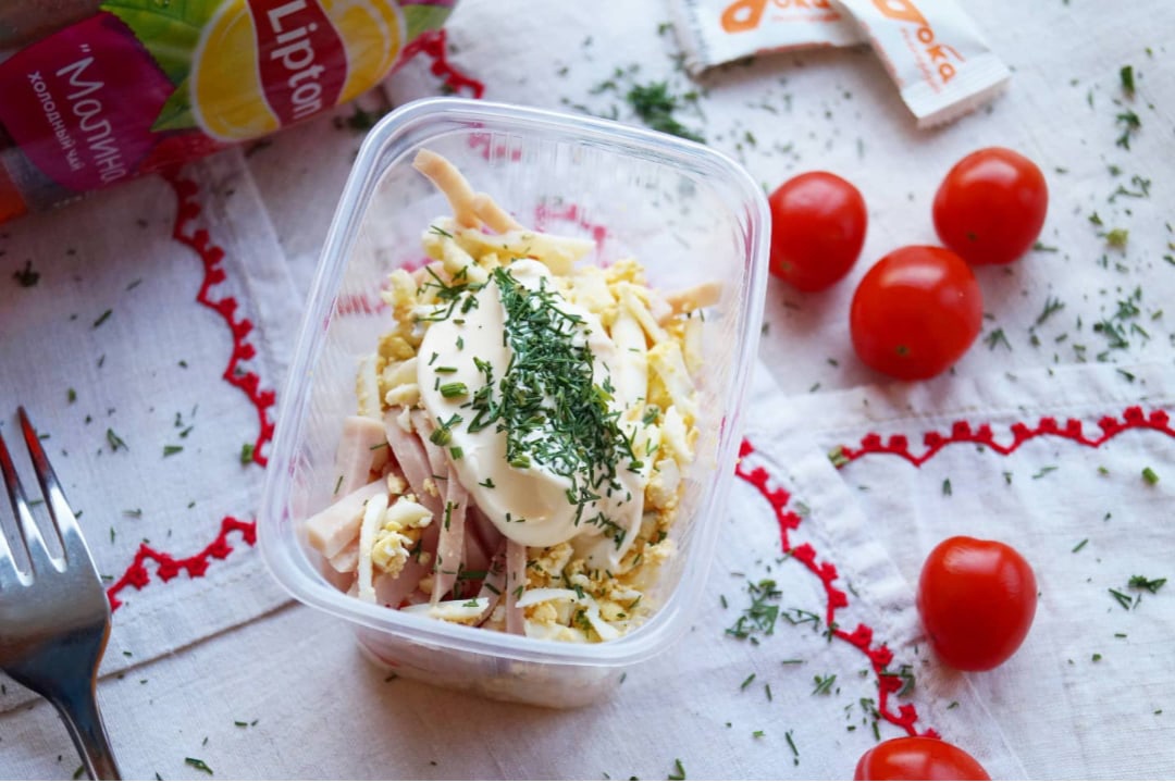 Помидоры свежие, яйцо вареное, ветчина, сыр голландский, майонез, зелень свежая