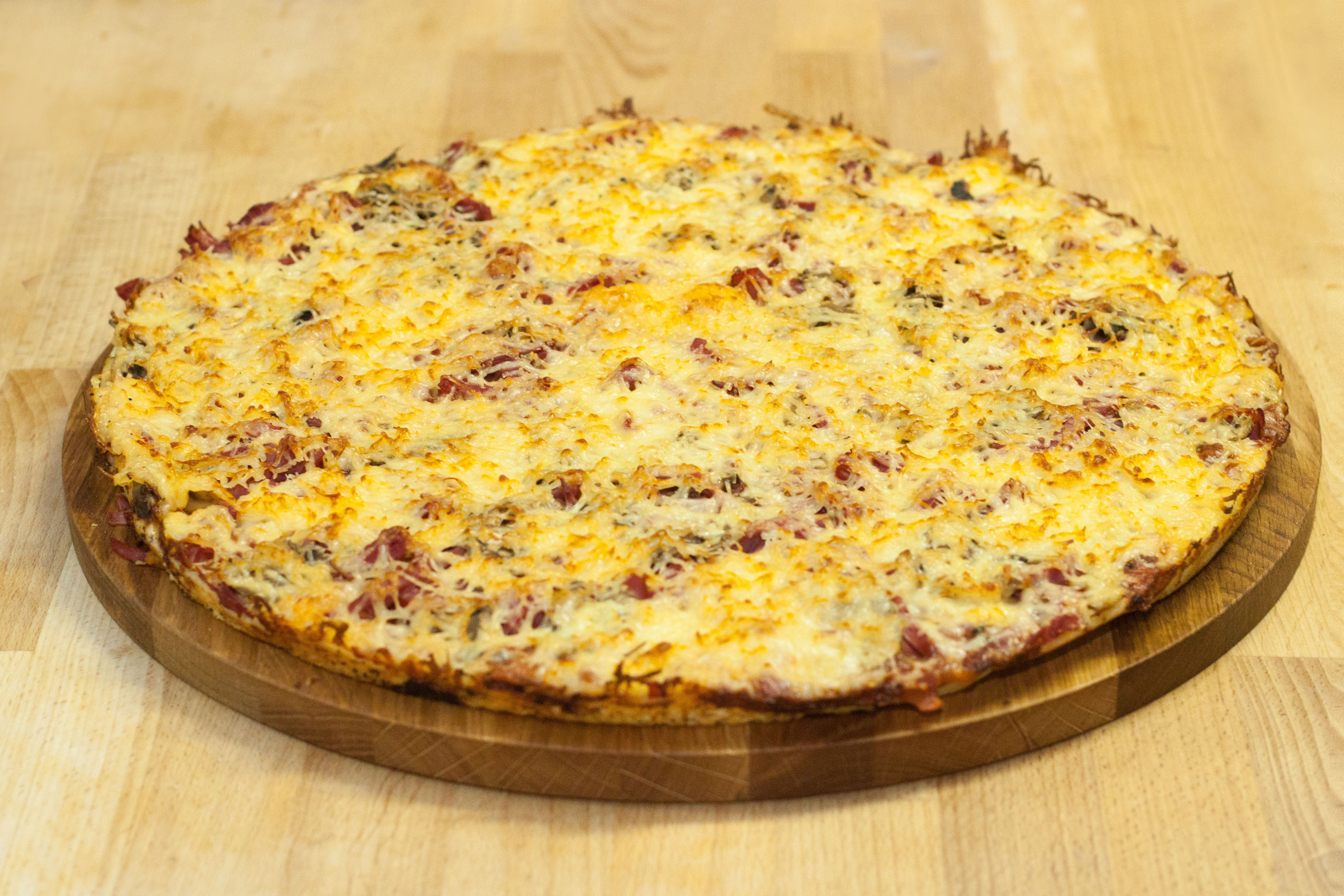 Говядина копченая, шампиньоны, сыр голландский, соус (кетчуп-чили, лук пассерованный, петрушка свежая, аджика, чеснок, масло подсолнечное)