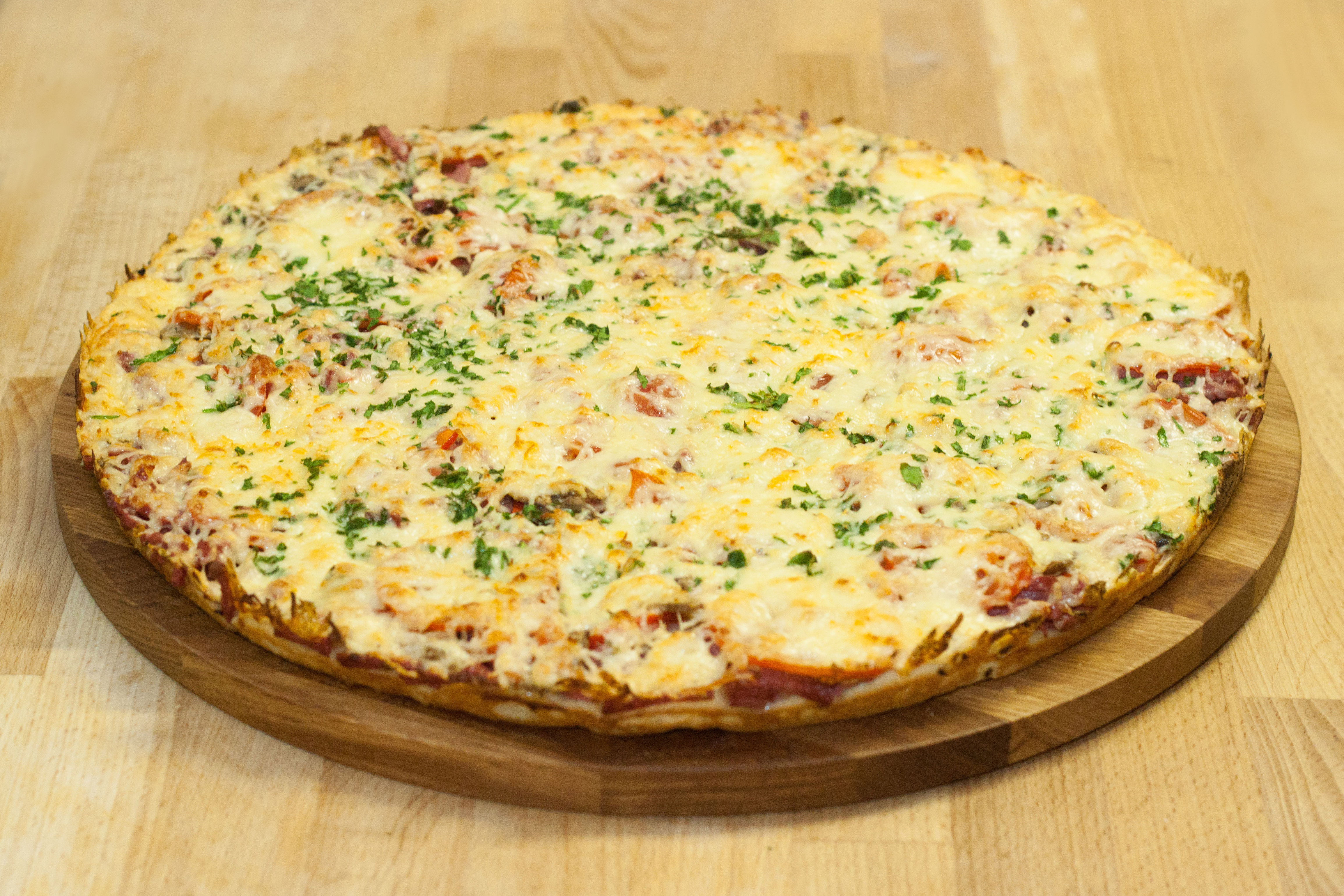 Колбаса полукопченая, шампиньоны, помидоры, перец болгарский, сыр голландский, соус (масло подсолнечное, чеснок, соль, орегано, перец чили, перец черный), петрушка свежая (на украшение)