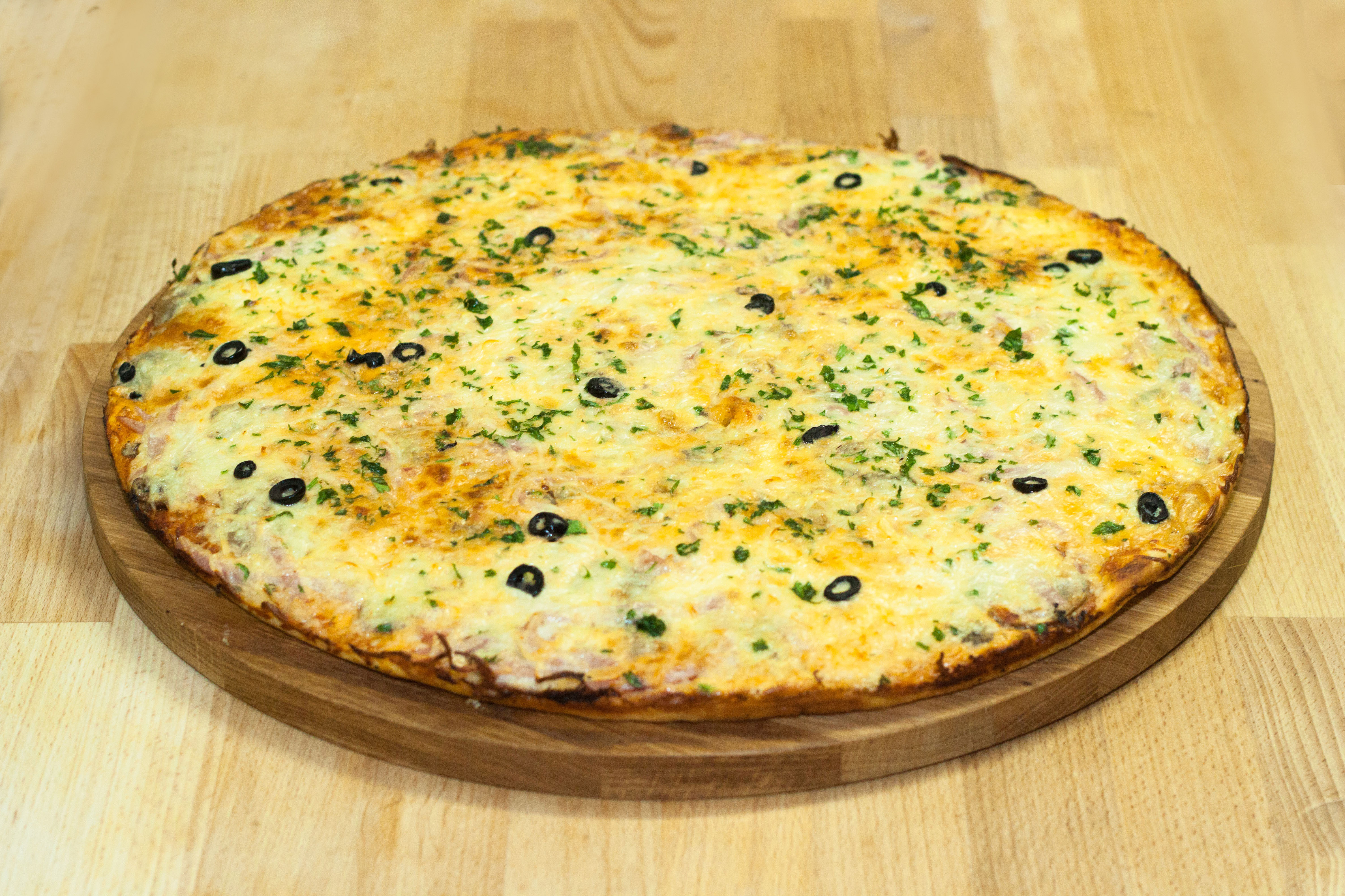 Ветчина, шампиньоны, сыр голландский, соус-кетчуп, маслины, петрушка свежая (на украшение)