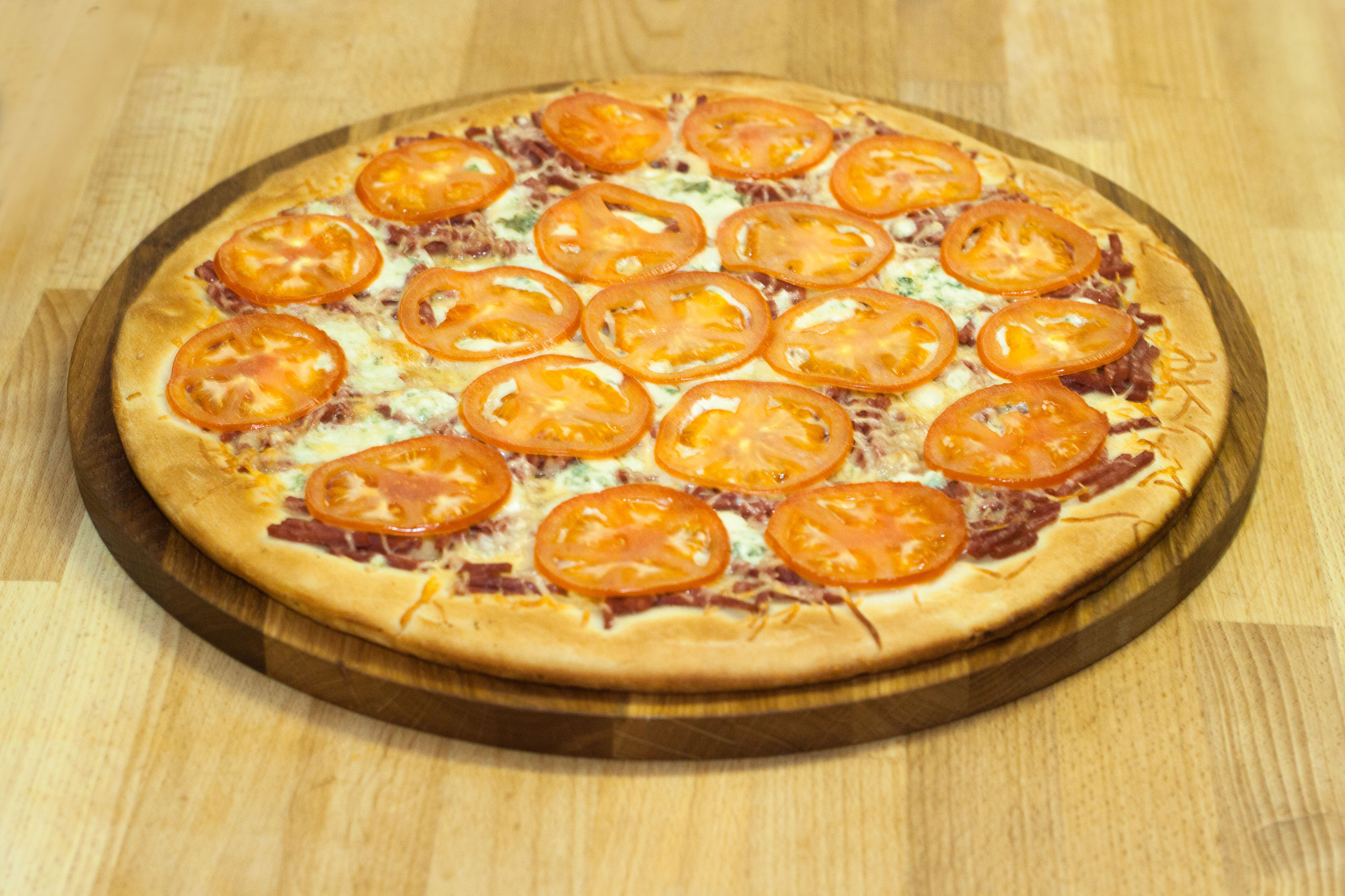 Колбаса полукопченая, помидоры, сыр голландский, сыр дор блю (с голубой плесенью), соус (масло подсолнечное, чеснок, соль, перец черный)