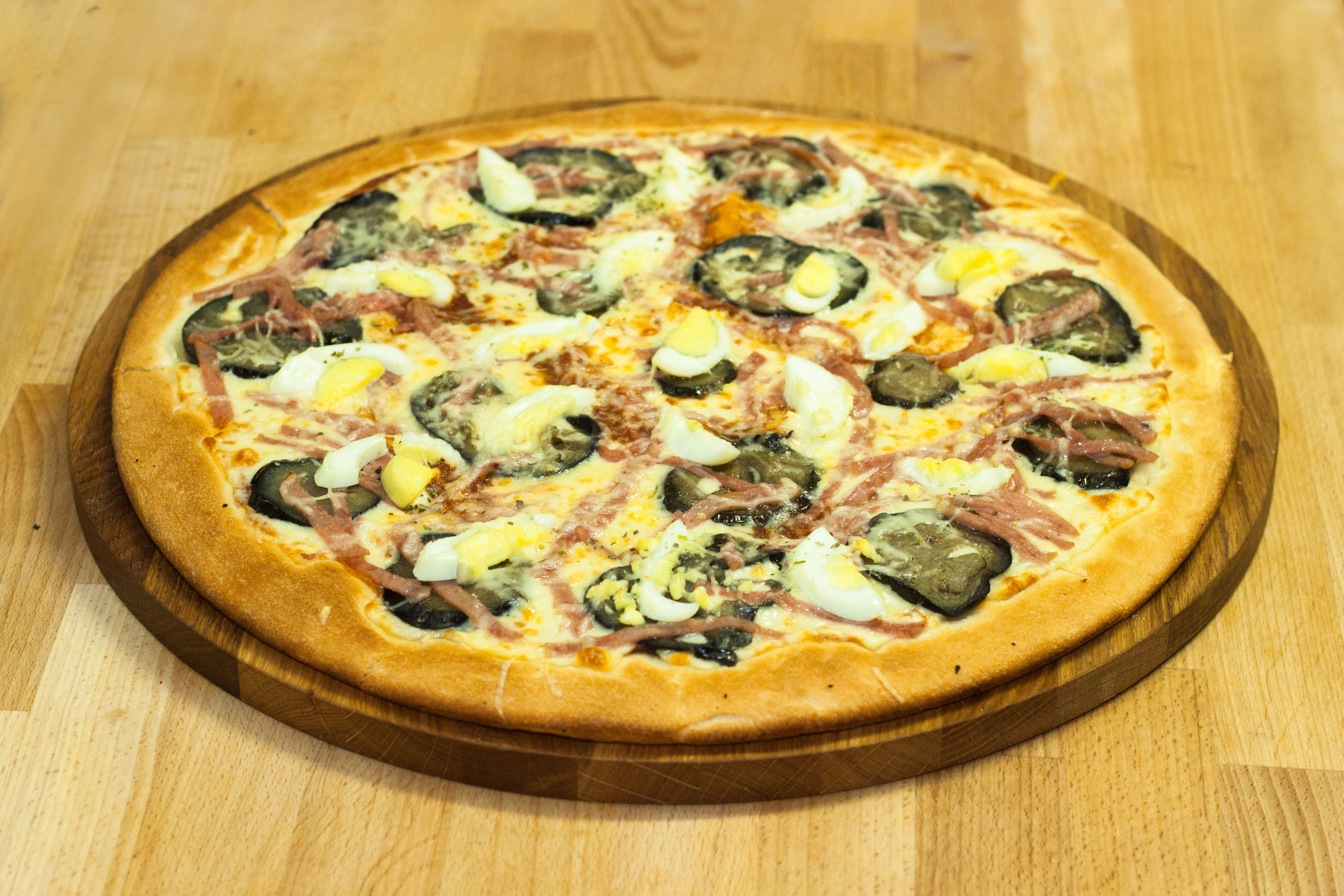 Баклажаны-гриль, ветчина, сыр моцарелла, сыр пармезан, соус-кетчуп, яйцо отварное, специи (орегано)