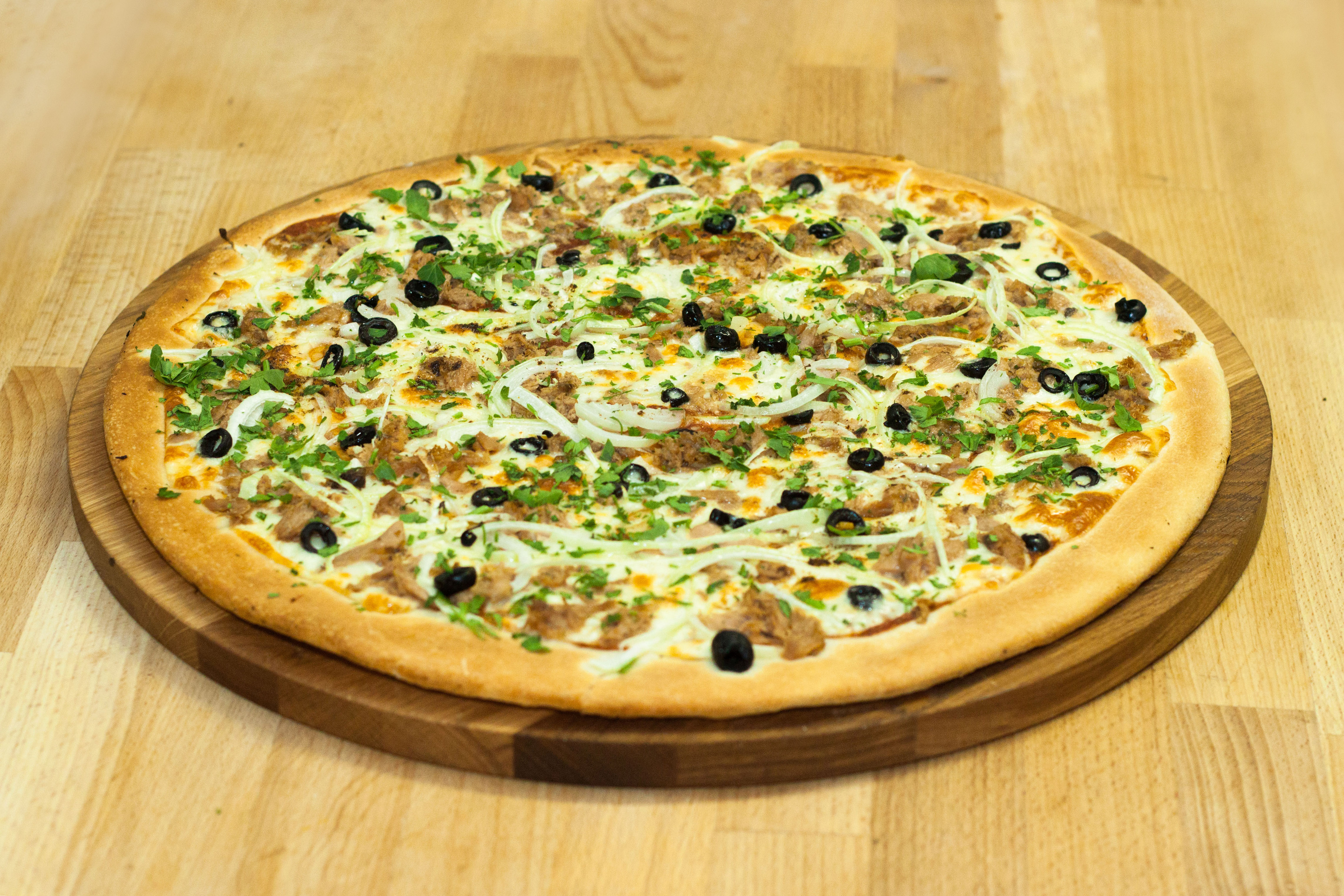 Ветчина, шампиньоны, сосиски молочные, яйцо отварное, горошек зеленый, сыр моцарелла, соус-кетчуп, маслины, специи (орегано)