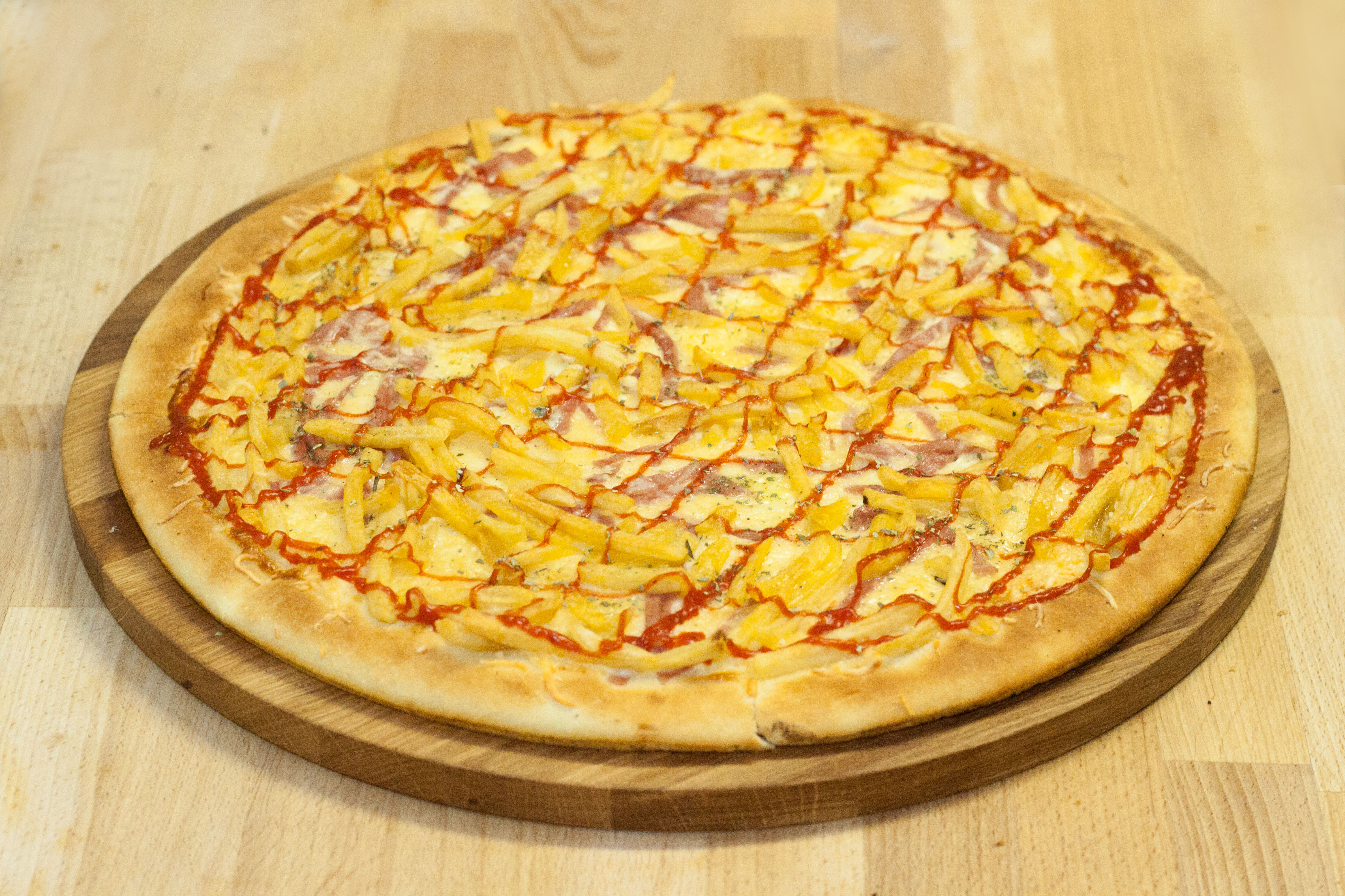 Картофель-фри, ветчина, сыр голландский, сыр пармезан, специи (орегано), кетчуп (на украшение)