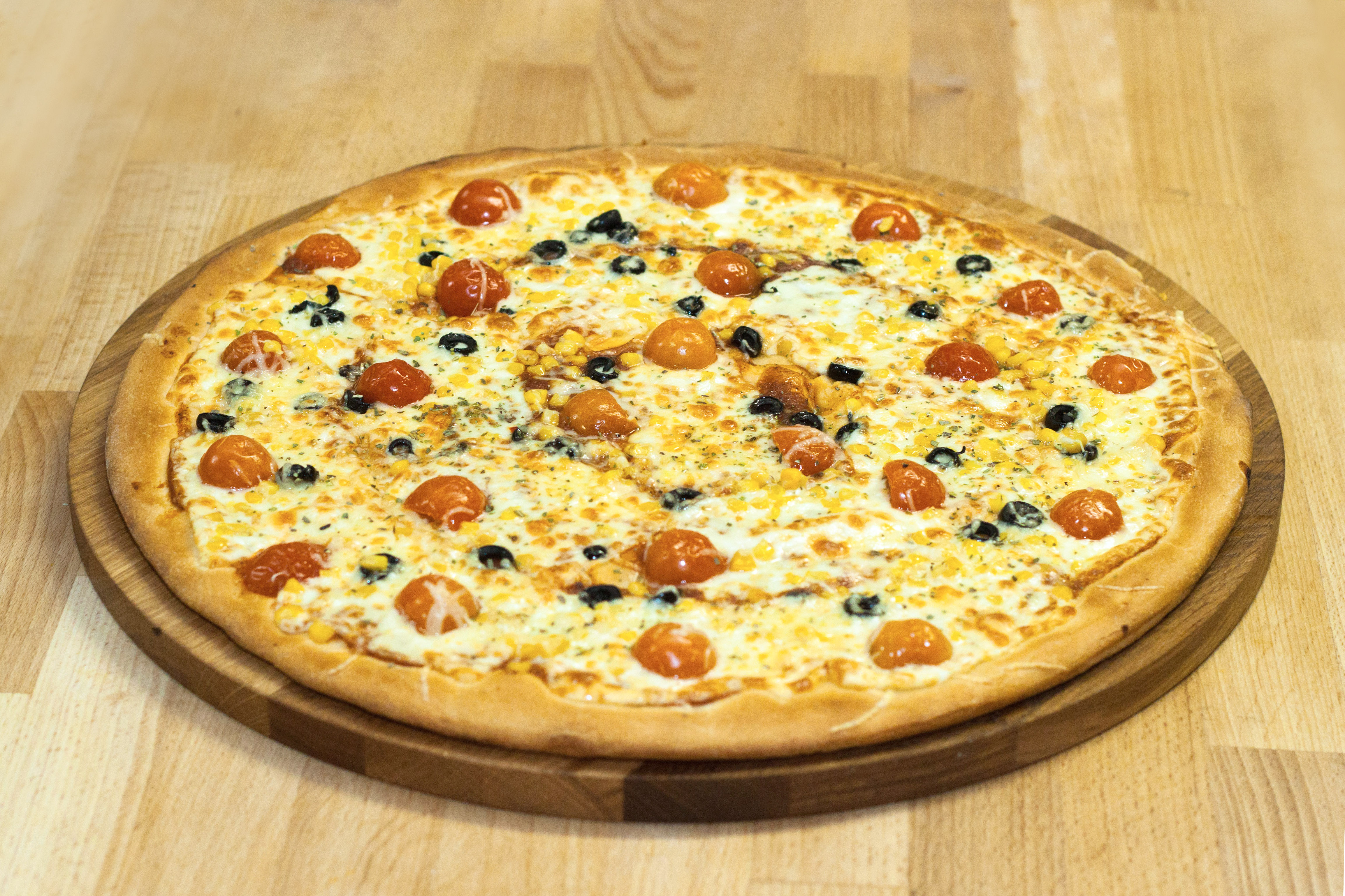 Кукуруза сладкая, сыр моцарелла, сыр пармезан, помидорки, соус-кетчуп, маслины и специи орегано (на украшение)