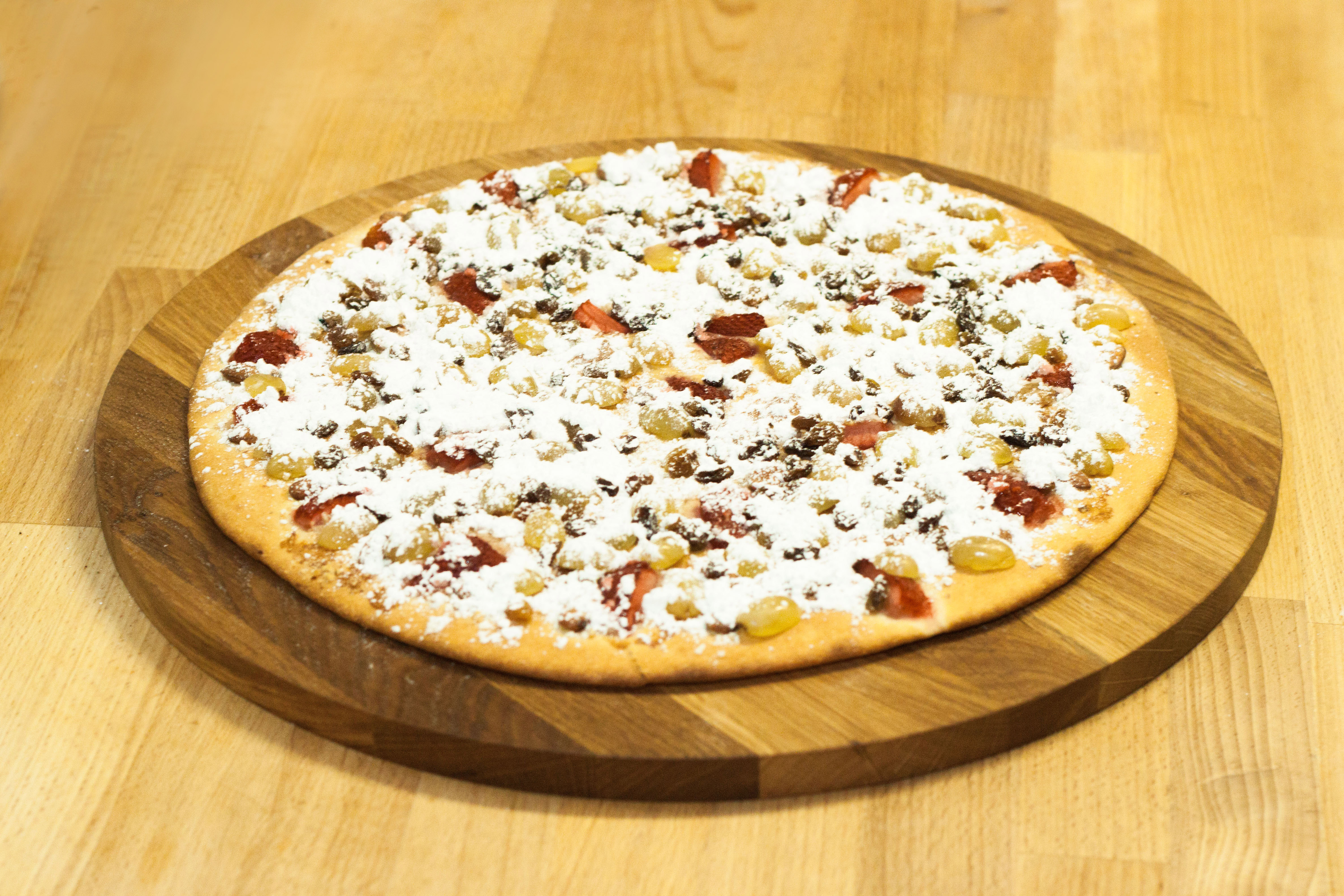 Орех миндальный, клубника, виноград, изюм, соус (желток яичный, ликер апельсиновый), сахарная пудра