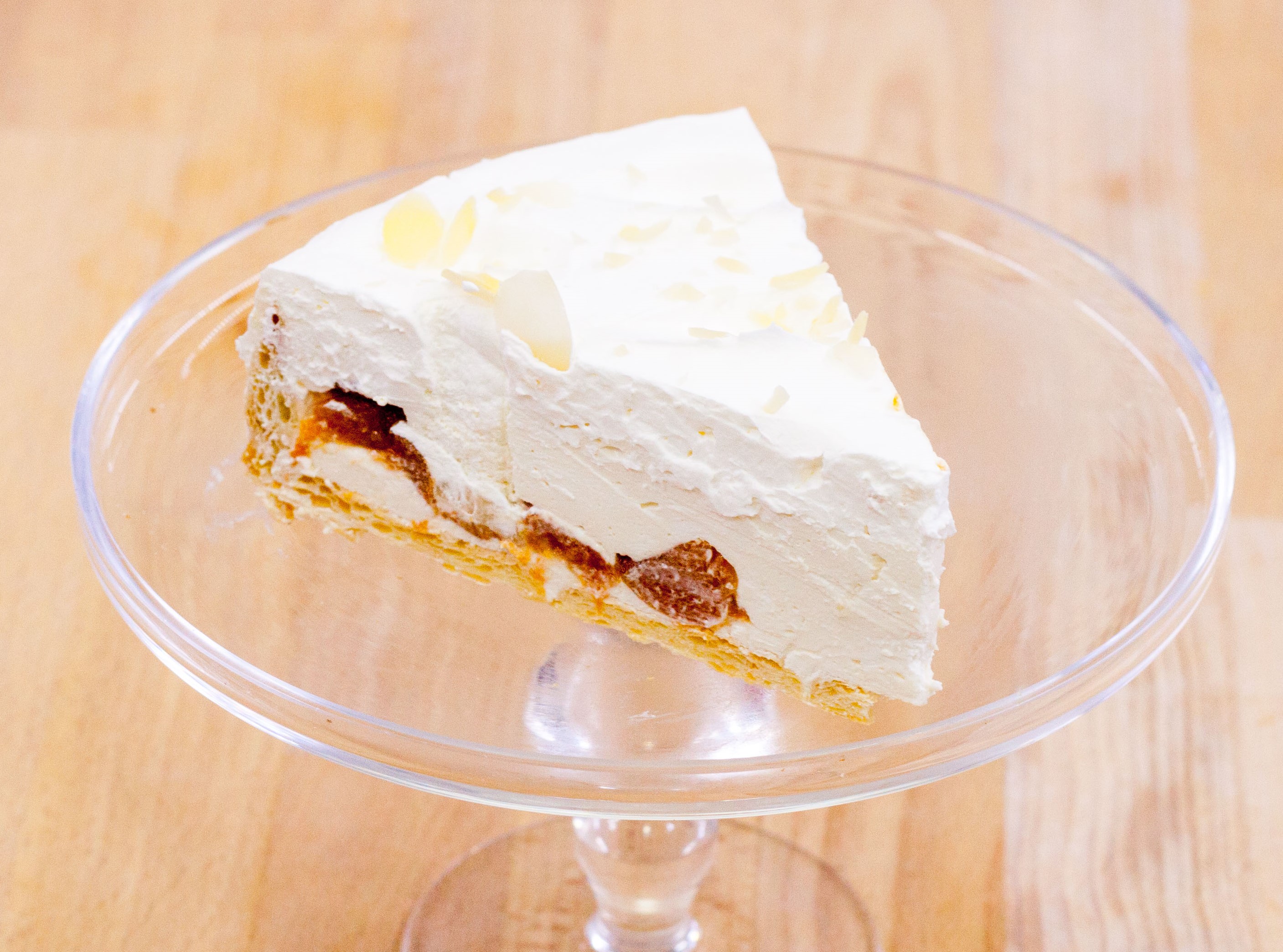 Крем: абрикос в сиропе (абрикос, вода питьевая, сахар, регулятор кислотности - лимонная кислота); сливки питьевые, сок апельсиновый, миндальные лепестки; тесто слоёное бездрожжевое (мука пшеничная хлебопекарная в/с, маргарин, яйцо куриное, соль, регулятор кислотности - лимонная кислота)